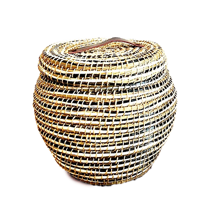 Kaisa grass round belly basket in black/white/natural weave, with lid and real leather handle.