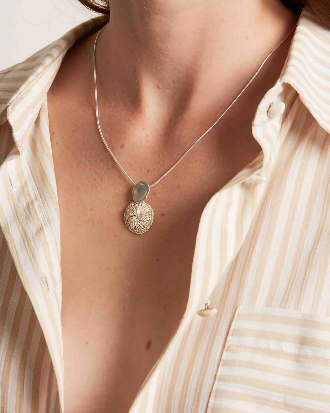 - 25mm gold or silver plated brass warped disc with 25mm handwoven natural fibre disc pendant