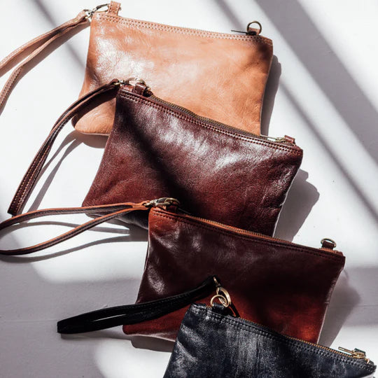 Carry her as is, sling her over your shoulder with the adjustable long strap, or keep her tethered with the wrist strap. Both straps are detachable, for the ultimate versatility! Jessie is a great size for travellers – fitting a passport and all the important stuff in a minimalistic leather approach.